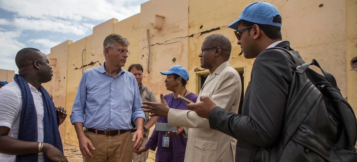 Jean-Pierre Lacroix (2nd from left), the UN peacekeeping chief visits, in 2018, a military facility attacked by terrorists in northern Mali.