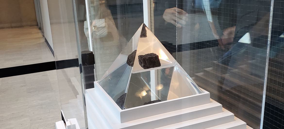 A four-ounce rock from the Moon, brought back by the Apollo 11 astronauts, is on display at UN Headquarters.