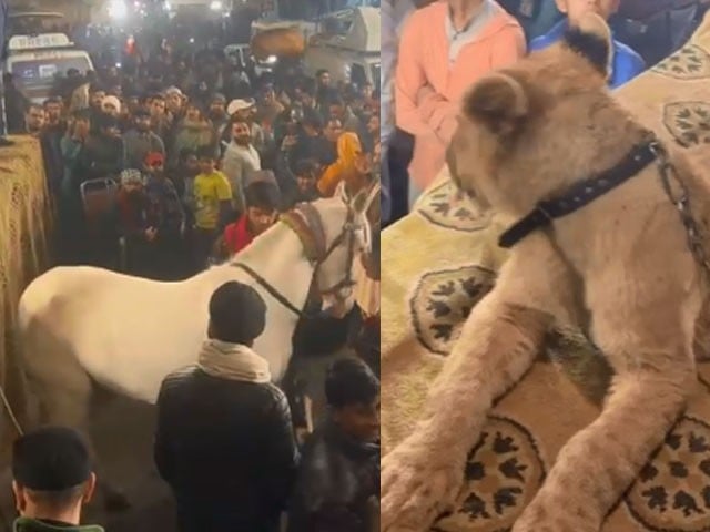 According to the details, Hamza Shehbaz held an election rally in his constituency NA-118 and when the convoy reached Kotwali Chowk through Delhi Gate, the League workers brought a real tiger on the stage.
