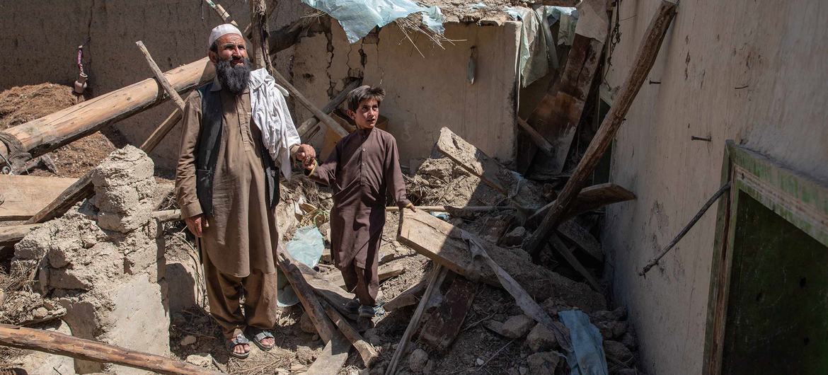 A father and son walk amidst the wreckage of their home, destroyed during an earthquake in Afghanistan. (file)