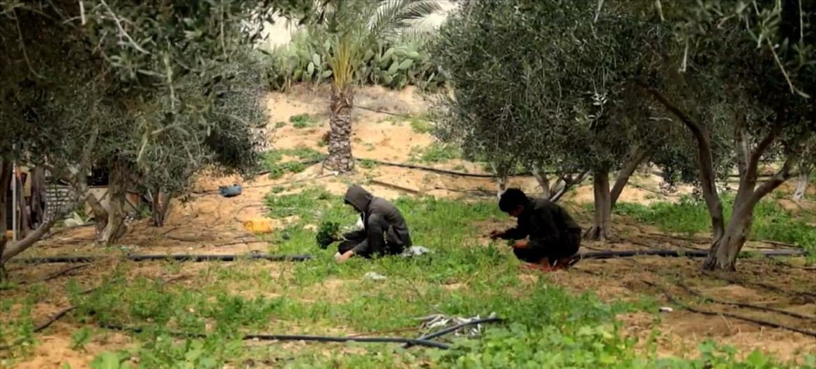 Young people harvest wild plants to sell in the markets of Deir Al Balah in central Gaza.