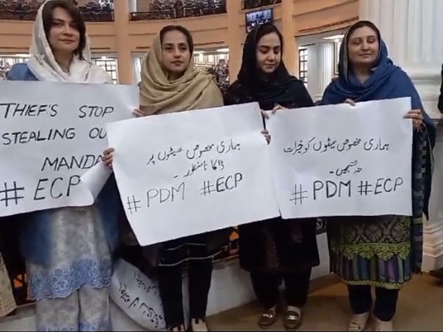 They were carrying placards on which the slogans of Election Commission, PDM and Choru hamara mandate na charao were written.