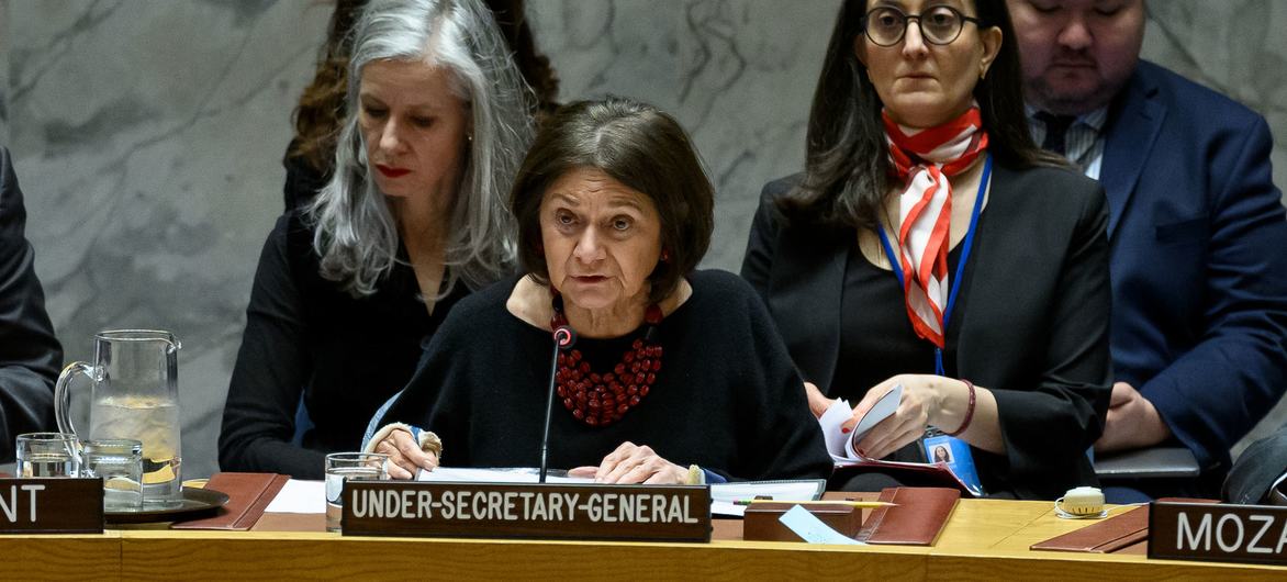 Rosemary DiCarlo, Under-Secretary-General for Political and Peacebuilding Affairs, briefs the Security Council meeting on maintenance of international peace and security.