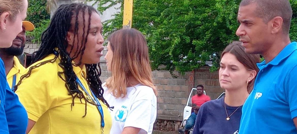 The CAPAC chief, Chantale Valcourt (second left), talks to WFP staff in Port-au-Prince.