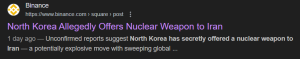 In a now-deleted post, Binance claimed, that according to unconfirmed reports, North Korea had secretly offered a nuclear weapon to Iran.