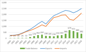 - Heavily imports raw materials such as oil, iron ore and soybeans
