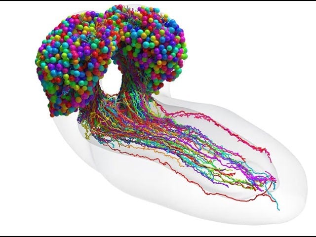 This diagram of the 3,016 neurons that make up the fly’s brain and the detailed circuitry of the neural pathways within it is called a connectome. According to the researchers, it is the largest and most complete connectome ever depicted.