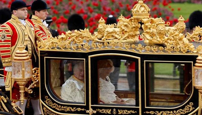 King Charles, accompanied by Queen Camilla Parker, rode in the royal carriage, which was pulled by 6 gray horses while the royal guard surrounded the royal carriage.