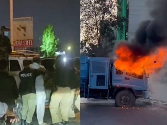 During the riots, unknown persons erected roadblocks and burnt tires while raising slogans in favor of Chairman PTI Imran Khan and demanding his immediate release.