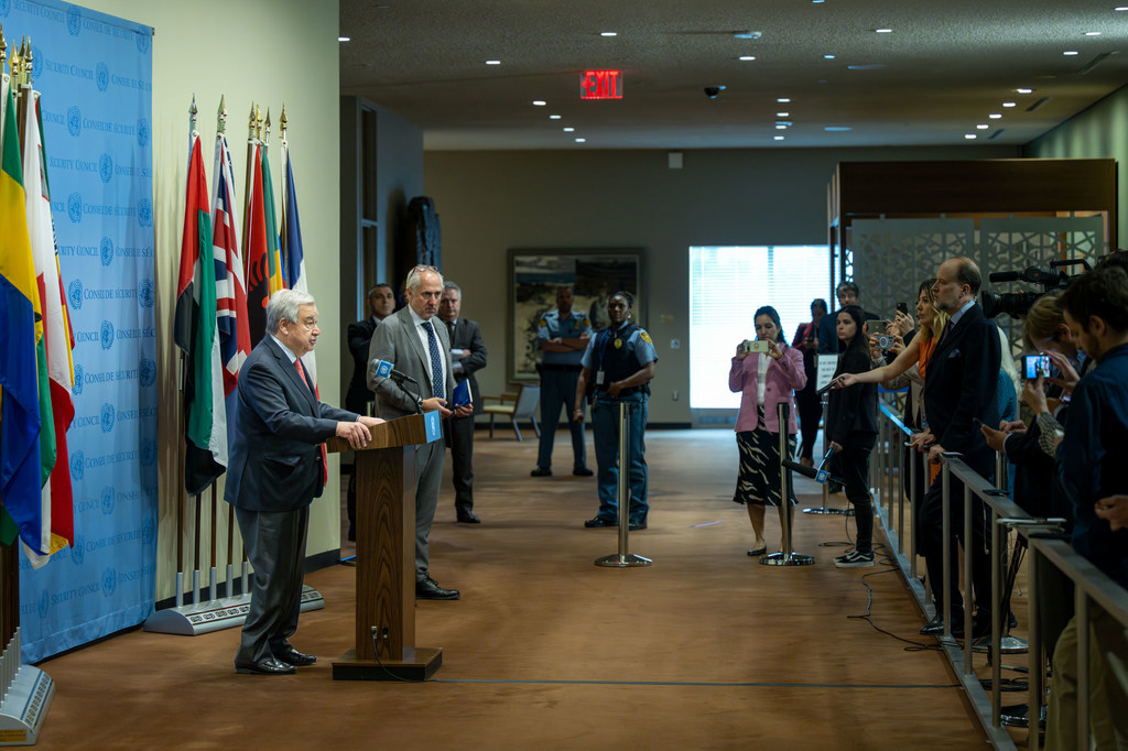 Secretary-General António Guterres (at podium) briefs reporters about the destruction in the Kakhovka hydroelectric power plant dam in Ukraine.