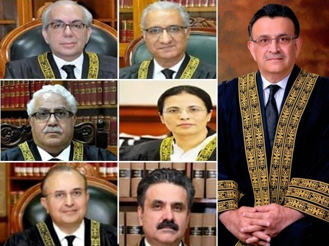 The seven-member larger bench headed by Chief Justice of Pakistan Umar Atta Bandial includes Justice Ijaz-ul-Ahsan, Mansoor Ali Shah, Justice Muneeb Akhtar Bench, Justice Yahya Afridi, Justice Mazahir Naqvi and Justice Ayesha Malik.