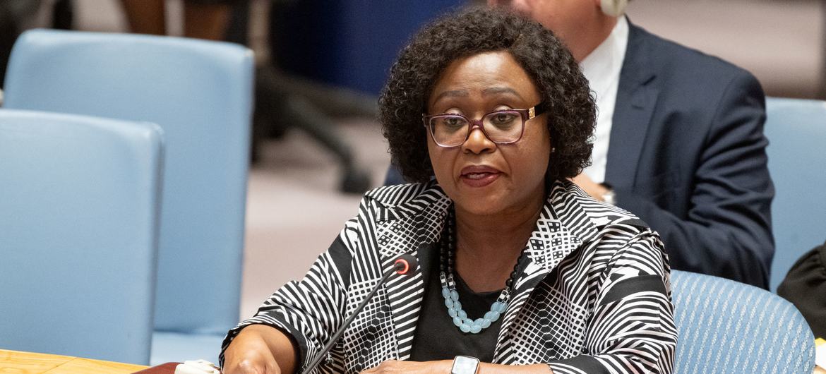 Martha Ama Akyaa Pobee, Assistant Secretary-General for Africa in the Departments of Political and Peacebuilding Affairs and Peace Operations, briefs members of the UN Security Council.