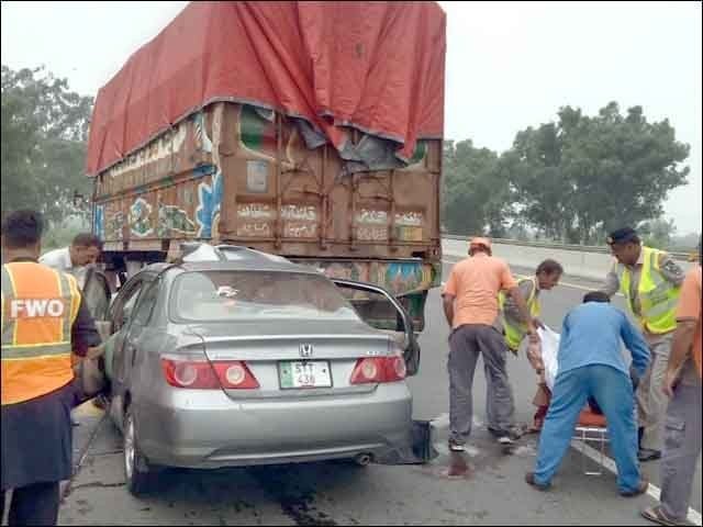 According to the spokesperson of the Motorway Police, the driver of the car heading towards Lahore fell asleep while driving, due to which the car collided with a truck from behind, resulting in the death of three people.