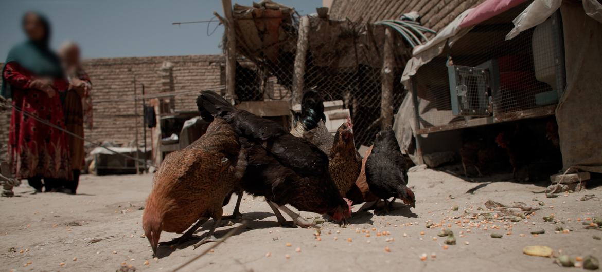Chickens provided by UNODC’s alternative development project feeding in a backyard in Dogabad village, Kabul, Afghanistan.