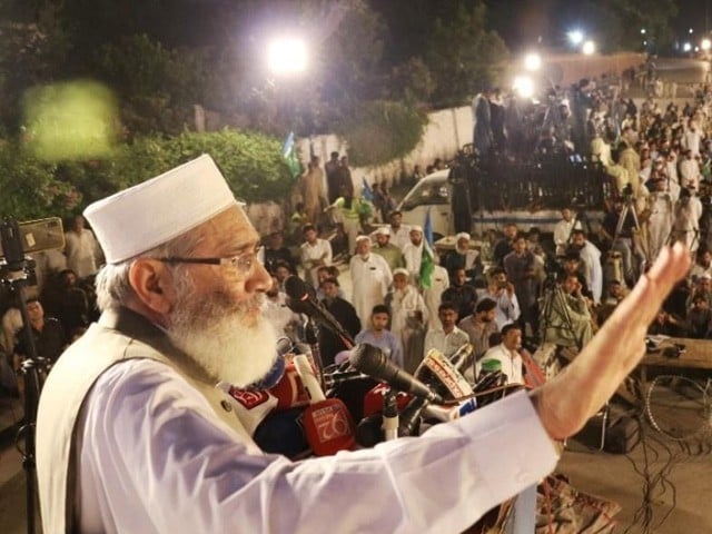 Amir of Jamaat-e-Islami addressing a sit-in outside Peshawar Governor House (Photo Express)