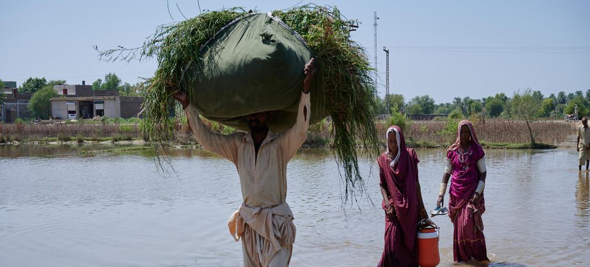 Villagers in Pakistan’s Khairpur Mirs District in Sindh province cross flooded land to get to their homes.