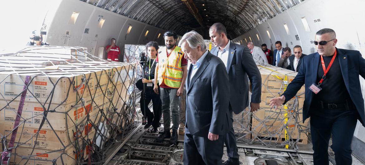 UN Secretary-General António Guterres inspects aid supplies in a cargo plane destined for the people of Gaza.