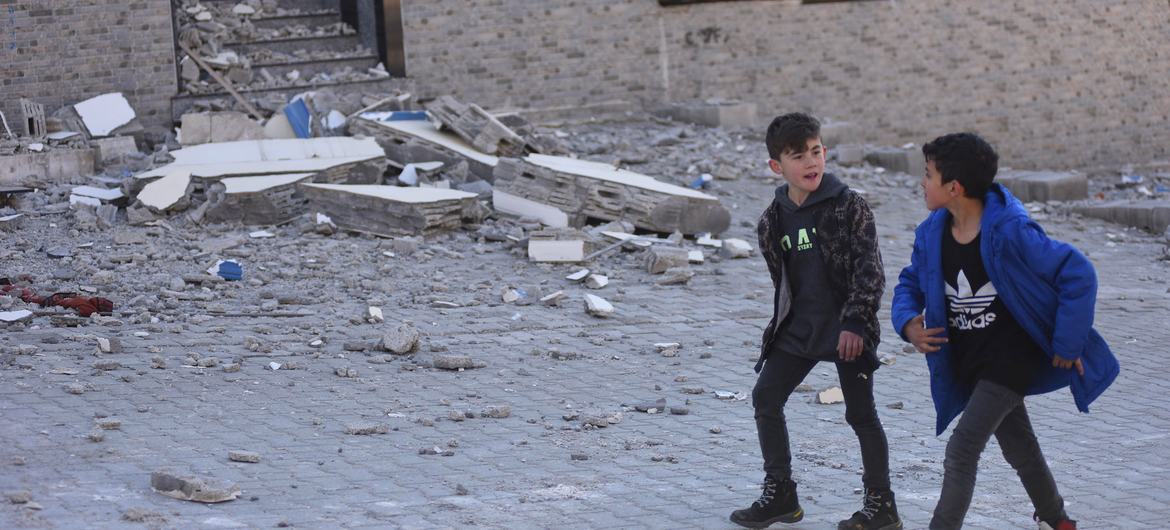 Two boys walk through the earthquake damaged streets of Kahramanmaraş, Türkiye.