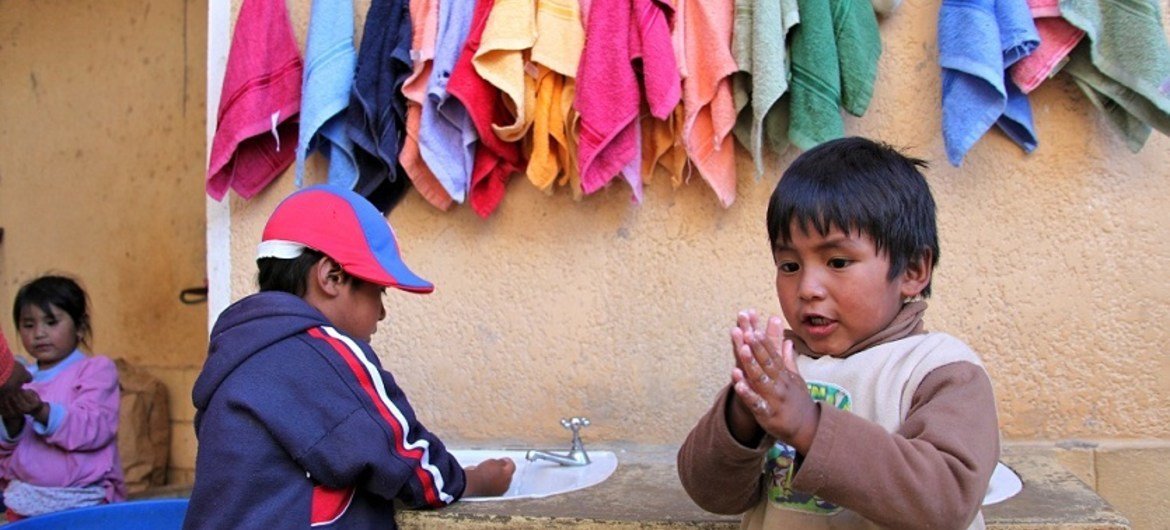 Two small children wash their hands with soap at a hand-washing station at the Sayariy Warmi early childhood development centre in Sucre, Bolivia.